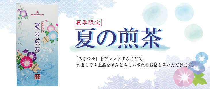 ニュース 2021.07.07 夏の煎茶 「夏の煎茶」7月2日(金) 夏にぴったりの清涼感のあるすっきりとした飲み口の季節限定茶です。 日本を代表する品種「やぶきた」を主体に、旨味とコクのある「ゆたかみどり」、 "天然玉露"とも言われる美しい水色と甘味のある「あさつゆ」をブレンドしました。 心地よい香りと、さらりとした喉ごしは、夏の暑い日はさっぱりと、ひんやり冷たい水出し冷茶、 冷房で冷えた体にはホッと温まるお湯出し煎茶と、気分と体調に合わせてお楽しみいただけます。 70g 税込1,188円 【お求めはコチラ】
