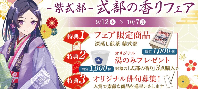 日頃より三國屋善五郎をご愛顧いただきまして、誠にありがとうございます。 9月12日(木)から各店舗で「紫式部 -式部の香り- フェア」を開催しております。 平安時代を代表する女性作家、紫式部ゆかりの地…